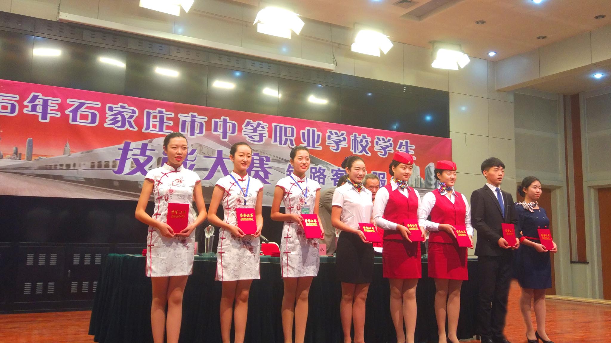 石家庄铁路技校全程石家庄铁路职业技工学校(石家庄铁路学校)是一所公办铁路专业学校。学校开设有多个铁路及地铁专业。11月29日我校学生马瑞娇、宋丽静、刘晓琴、赵小怡、张善、李雨珊六位同学参加了“2016年石家庄市中等职业学校学生技能大赛”铁路客服专项比赛,分别获得了团体一等奖和二等奖。刘晓琴、马瑞娇获得了个人一等奖,宋丽静、赵小怡、张善、李雨珊获得个人二等奖,张娜娜老师获得了市级优秀指导老师奖。